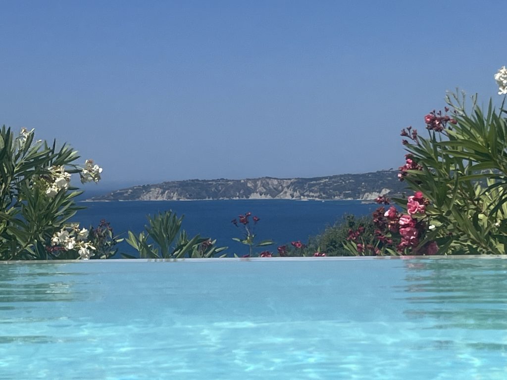 In the center of the garden, the infinity pool (17 x 8 m) with a large 280sqm wooden terrace is the master piece of the property with its amazing view on Lourdas Bay.
