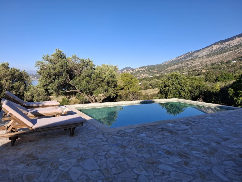 The swimming pool and its sunny terrace with an amazing view on Lourdas bay and on Mount Ainos allow the guests of Ol Aspra to enjoy relaxing moments.