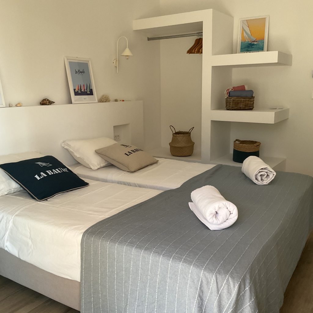 All the bedding is Greek : Candia mattresses are made of raw materials to correctly support your spine, and the cotton fabrics are coated with olive oil to have natural antibacterial protection to the skin.